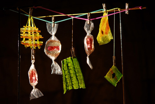 Une préparation effervescente et pétillante est capturée dans une gélule rouge transparente, elle-même prise dans une gelée à la fleur d’oranger. Puis emballée comme un gros bonbon.